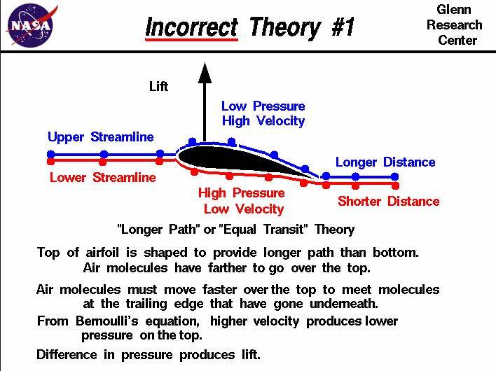 The incorrect part of theory, is that "air molecules must move faster over the top to meet molecules at the trailing edge that have gone underneath".