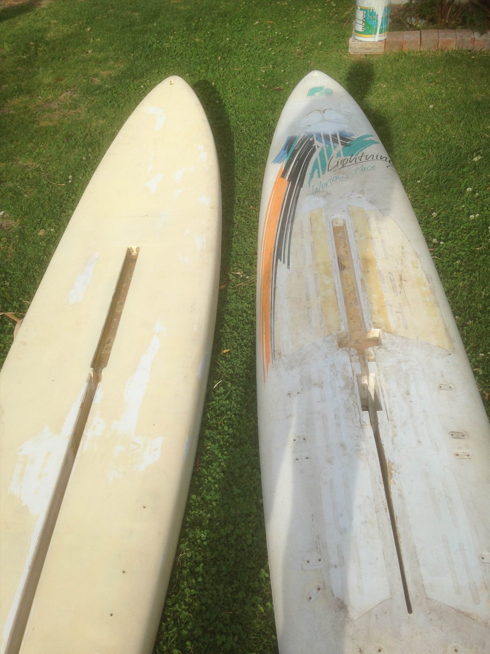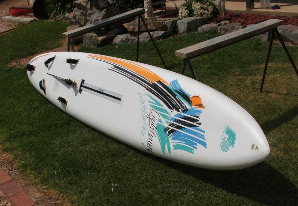 Here are photos of the actual board,its obviously had a hard life and some damage and repairs . It has no official IYRU sticker or serial number but it is clearly an early 90's lightning. Would this board be accepted as 100% legal by the race committee?