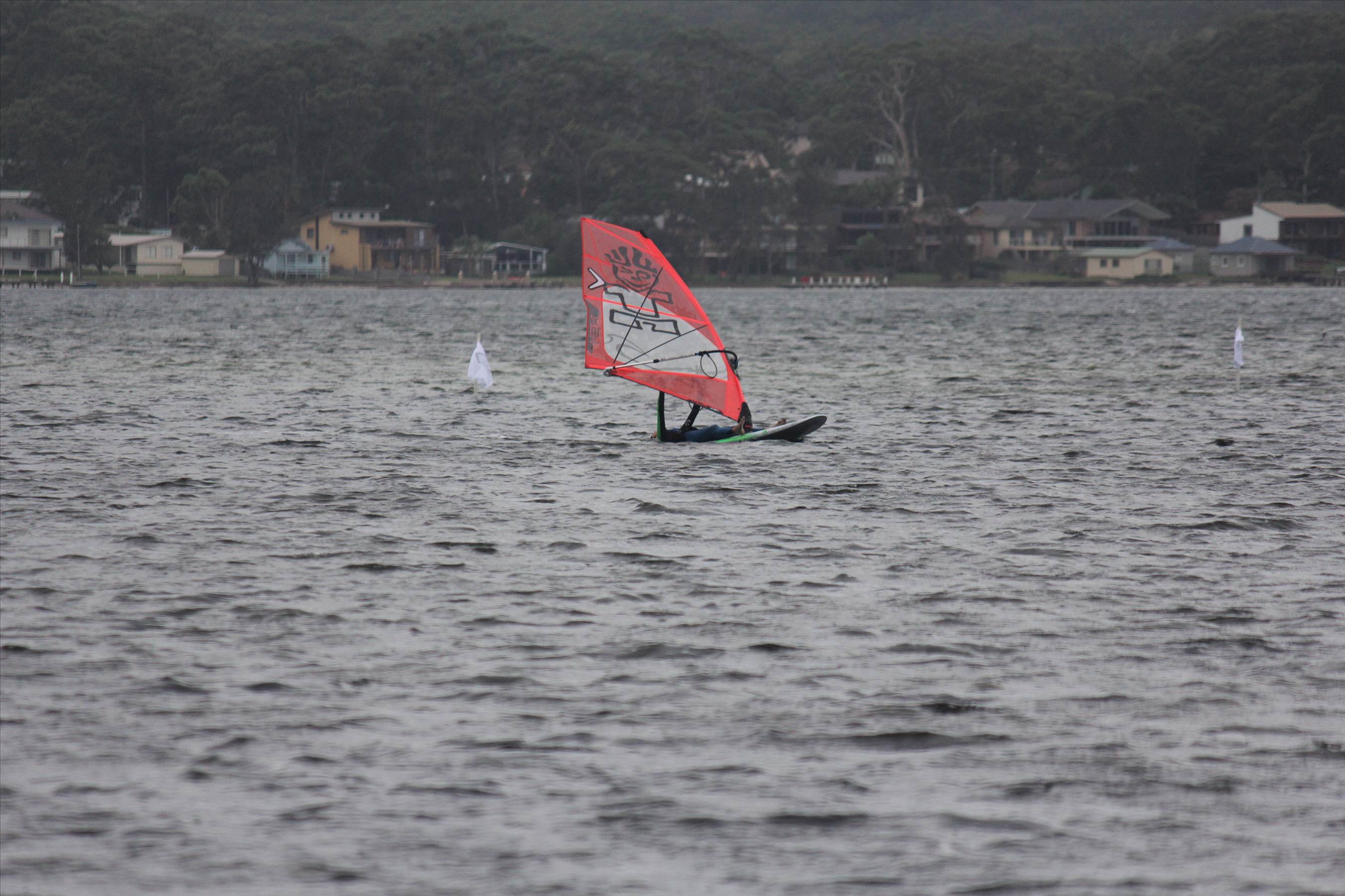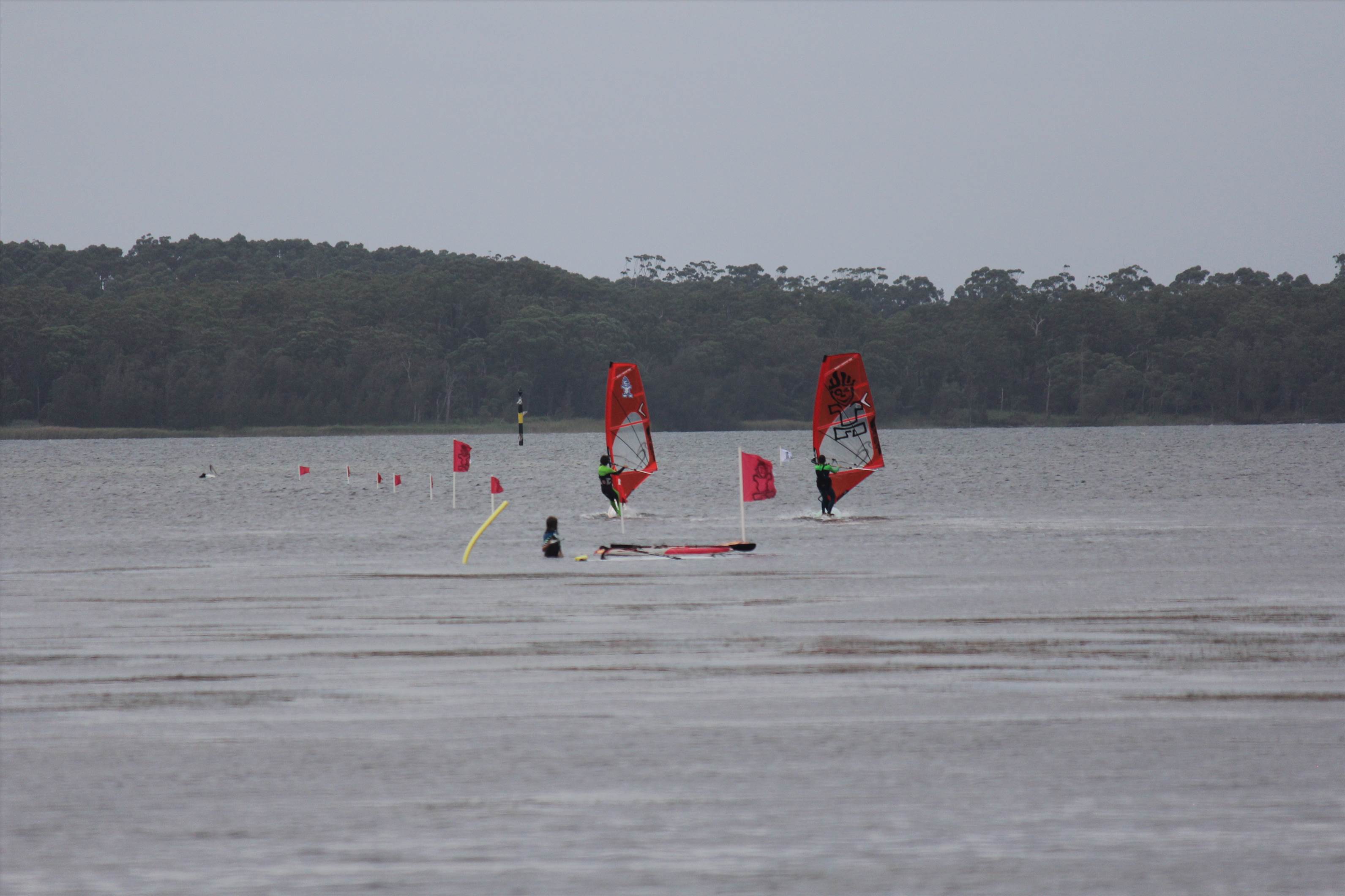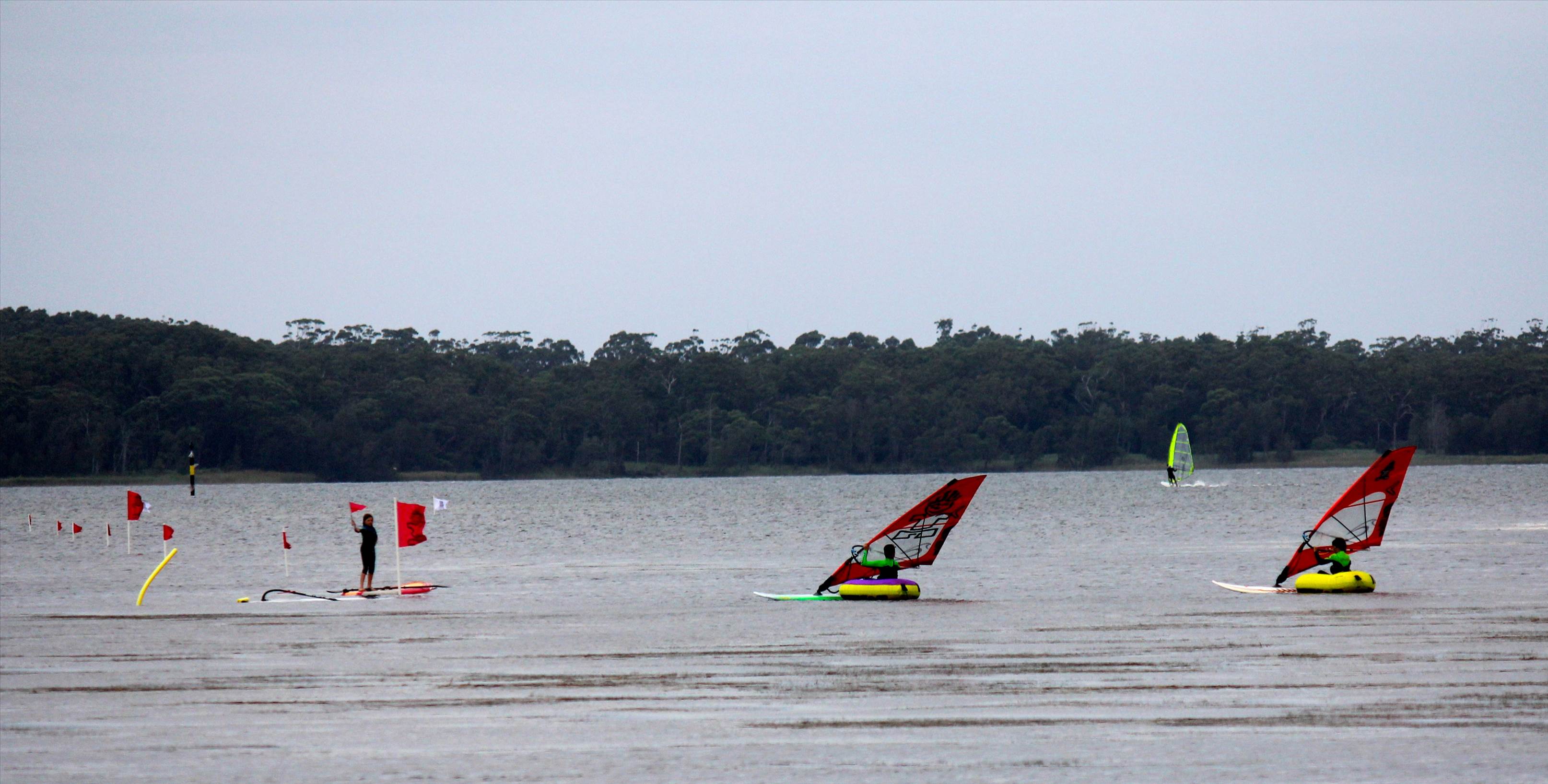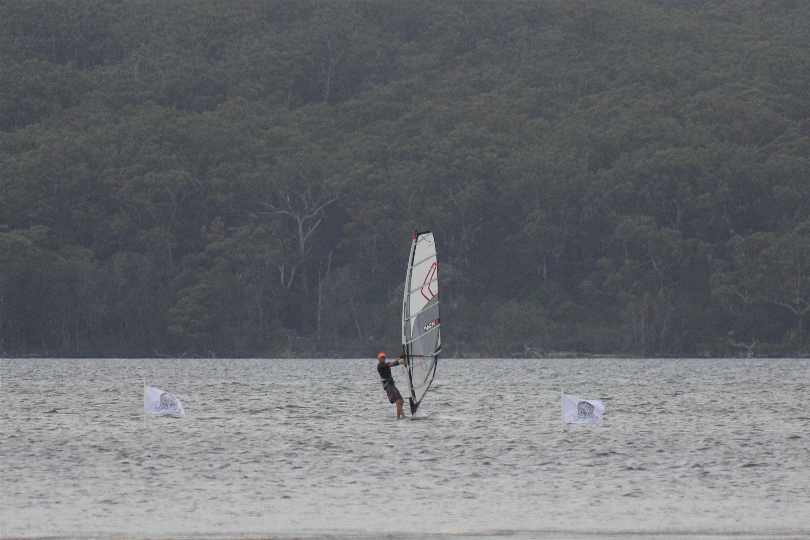 We were expecting 18-20 knots and set a very broad course to take advantage of the usually smooth water on the speed strip. Unfortunately, we started with an overcast sky and the wind never had a chance to kick in properly. Light rain sealed it and the ACT Gustbusters and other local windsurfers were forced to postpone the race to another day!
