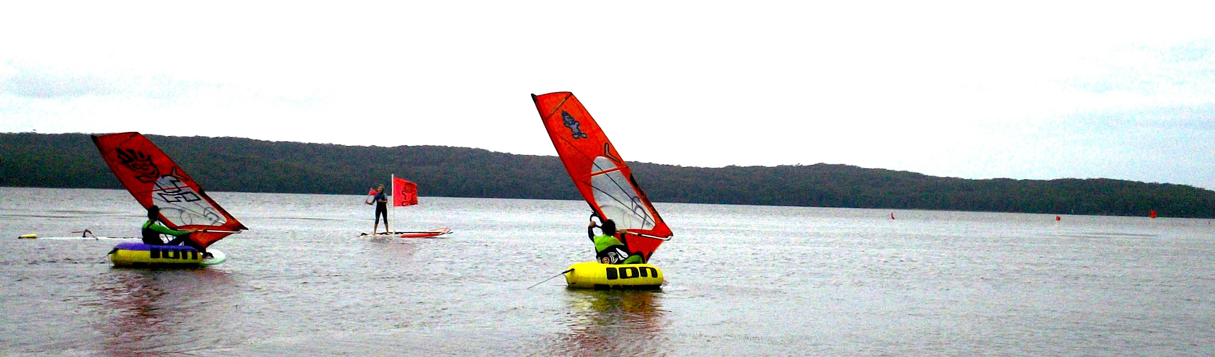 With no GPS needed and a total equipment cost of less than $200, the racing format involved a short and simple one-on-one downwind drag race from a seated start on pontoons, feet in the straps and sails powered up to a marked finish line near the boat ramp.