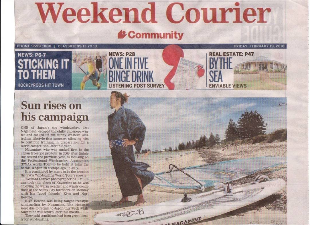 Windsurfing made it on to the front page of our local newspaper. Its a piece on our Japanese freestyle friend Dai Nagamine J111 otherwise known as Dai Hard or Dai Tanic. Good stuff!!!!