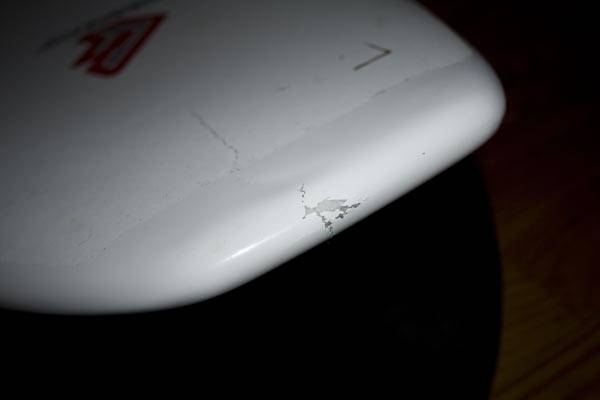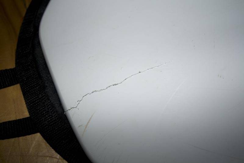 the board is still hard around the crack and doesn't give any when i give it a good squeeze. strangely the top crack doesn't meet the dent at the nose which travels underneath the board.