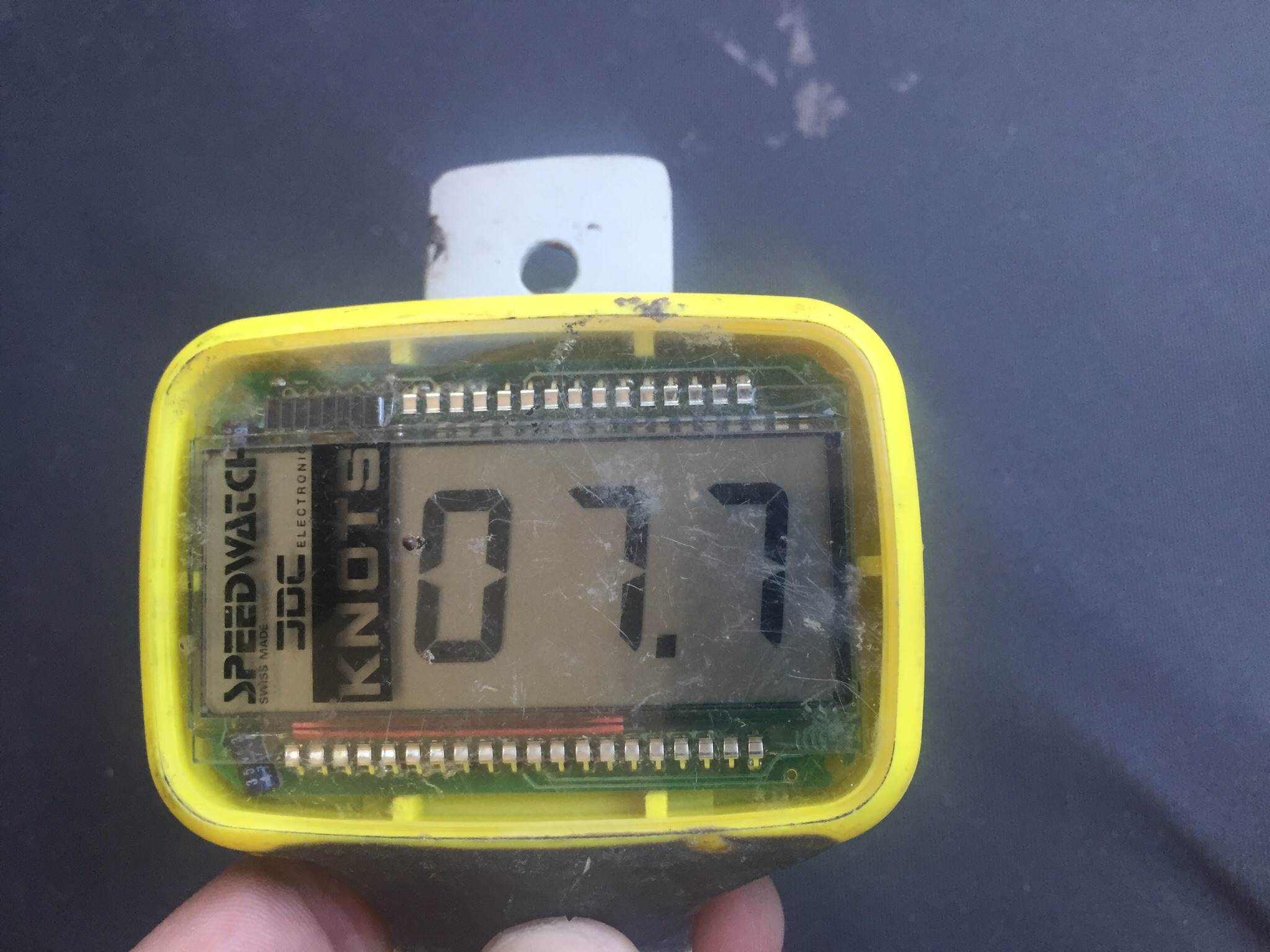 The device we used on the back of our boards was the 'SpeedWatch' made in Switzerland. There was another slightly different version called 'SpeedMate' which may have been made in the USA, but it had very similar features. They were completely sealed units that used solar power and were sensitive to the magnetic pulses from a rotating prop in close proximity. They had no buttons or controls at all. They disappeared off the market after a few years because the market was not big enough (and it was much bigger in the '80's than now). Sound familiar? I used these extensively in the 80's and early 90's. I thought they always read a bit slow!