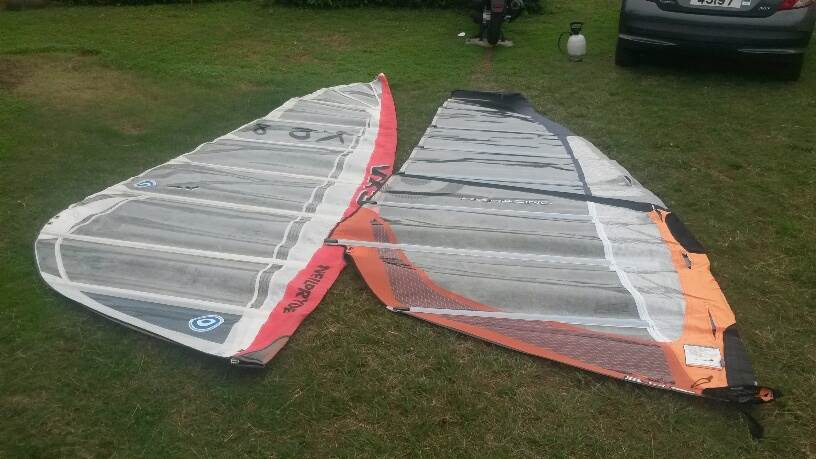 Pulled out the old race sails from back in the day. Still in amazing shape as I lost interest in windsurfing around 1998 for a fair period of time. The size of the luff sleeve on the newer sail is amazing as compared to the VX series!
