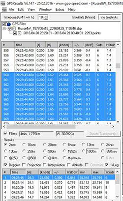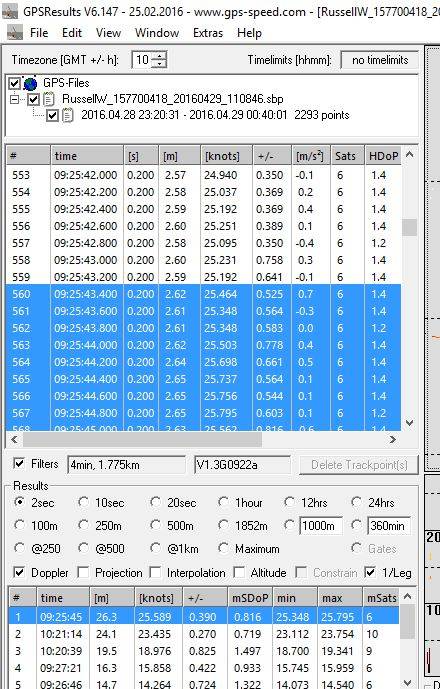 And the 2s display on the unit is less than all of them. Ahh yes, I think I see, it's possible the 25kt 2 sec hadn't made it into the max records, if it's still on the main display? So that makes the #2 gpsresults @ 23.415? very similar.