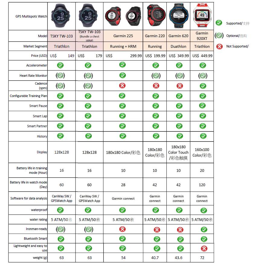 So are the TW watches also programmable, so that they could show 2s, 10s and 5x10s for example? Or the current 10s after a gybe? The Forerunner 920xt btw has a screen resolution of 205x148 not 160x100 and weights 61g not 72g. So I assume that the info on the table is not quite right. It also costs USD 329.99 nowadays.
