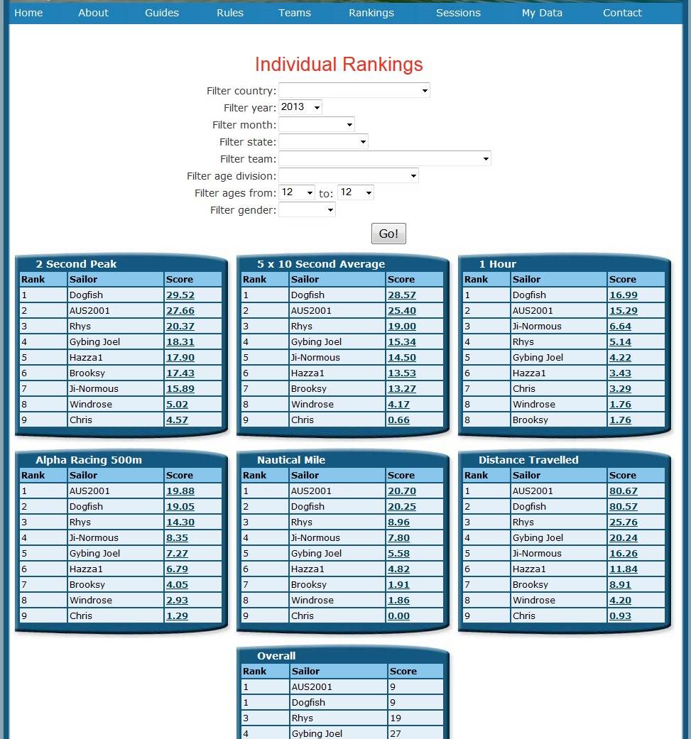 Filters just won't work for the kids. Ranking (just like that available for the combined adults, women and under 13s) is important and the current junior division just has too great a range to be useful/meaningful. Most kids also don't totally appreciate all the technical components of their sailing yet and alpha scores, hour and 5x10 are usually lost on them. Even 2 second usually has to be translated into km/hr. They appreciate PBs but their speed is low compared to the majority of scores on the website and this is not very encouraging.