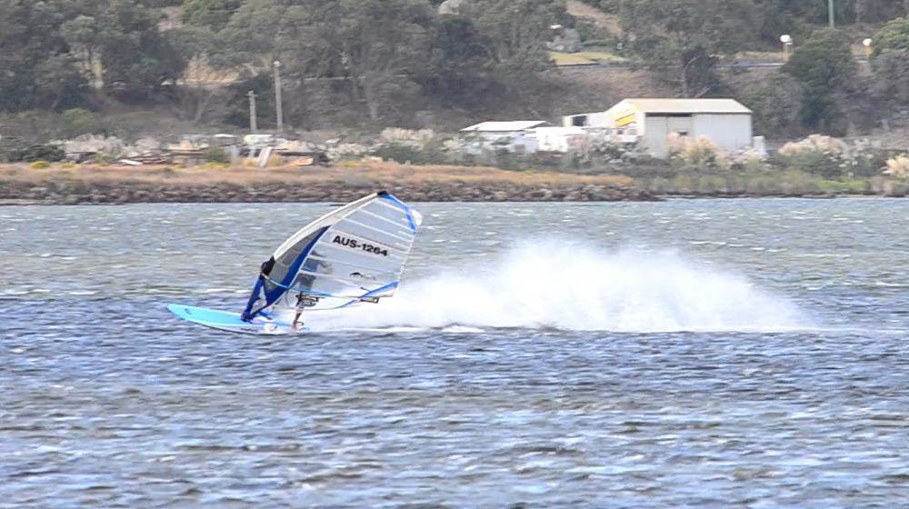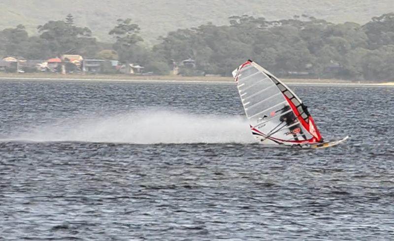 You can tell that's flat water - no knee bend in the gybes - looks like they're just standing up and posing for the photo while the board goes round!