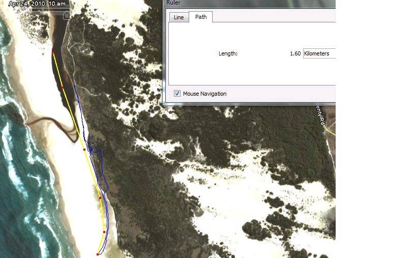 Before we went out sailing, we walked the length of the run to check it out and I took my GPS. The southern most part of my track is where the run turns and heads out to sea. We didn't sail all the way to the end, as the fastest part of the run had alread been had and it only meant further to walk back if you did, but you could quite easily sail to this point (and out to sea!!).