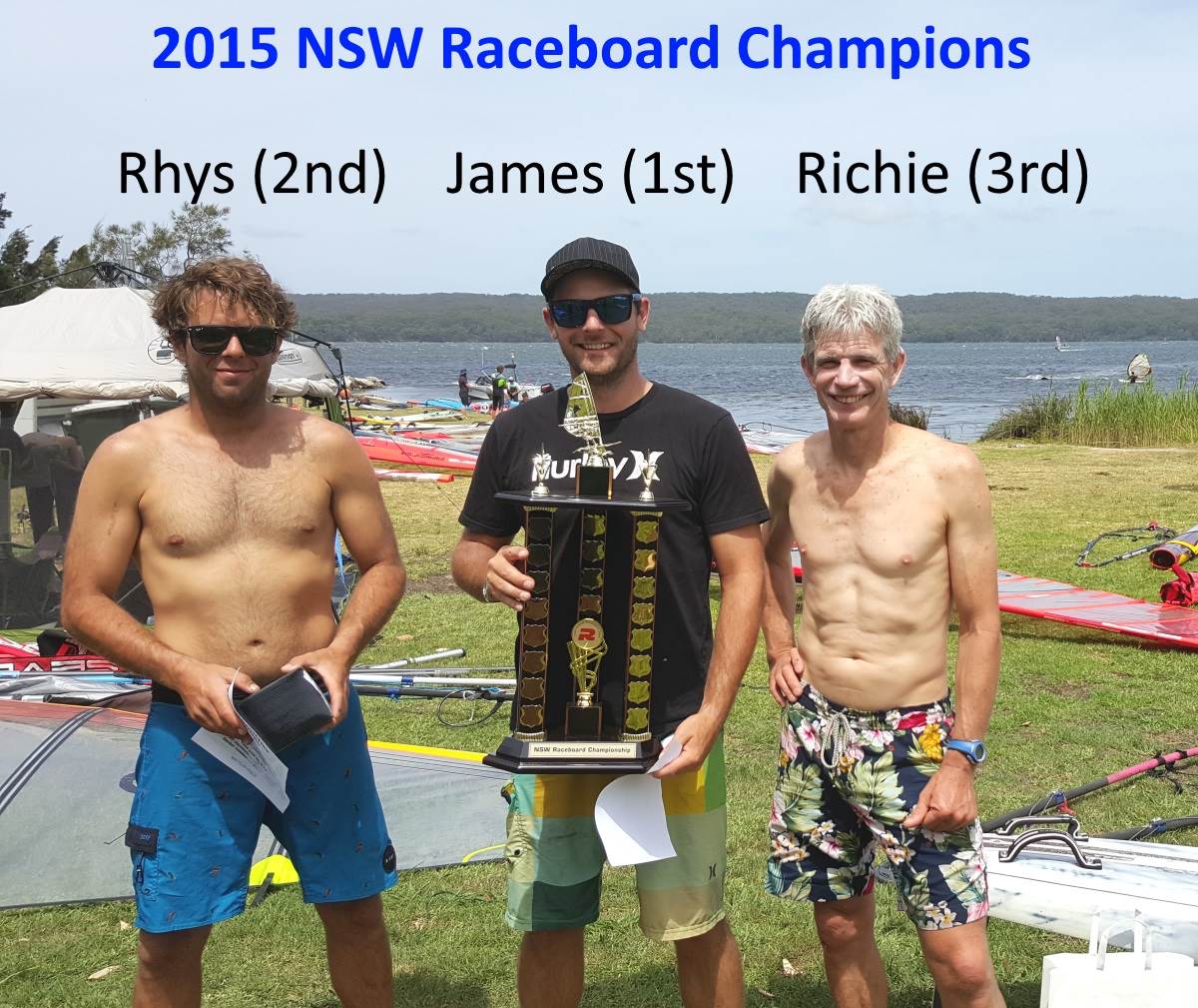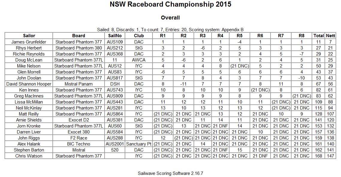 A very successful weekend of raceboarding was held at Sanctuary Point resulting in James Grunfelder being crowned 2015 NSW Raceboard Champion. Eight out of a possible 10 races were completed over the two days with winds on Saturday proving to very tricky with many gusts and holes and direction changes. Wind strength was maybe up to 15 knots or so and water conditions were quite flat. James set the scene from the first race scoring a victory and following up with the next 3 races. Doug McLean provided the only road bump in James's total domination by taking race 5 in the failing wind.