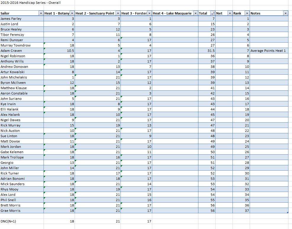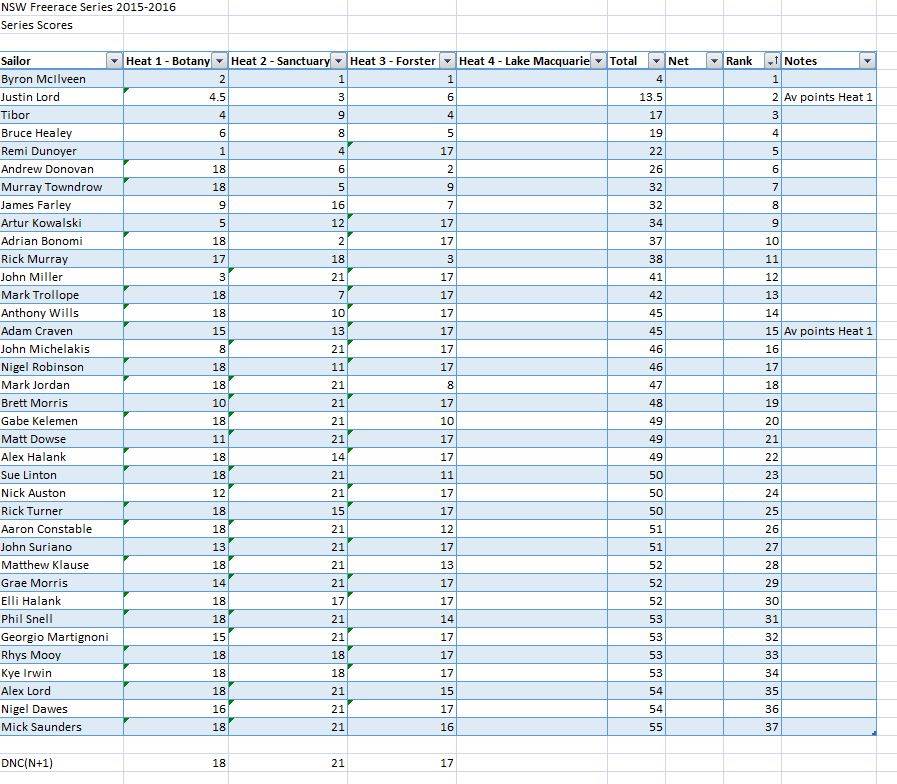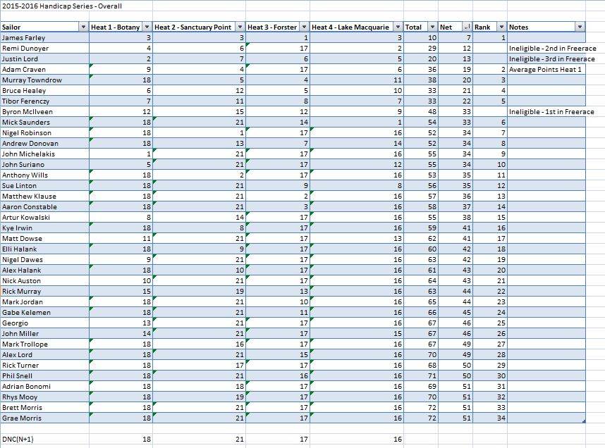 Here are the current series standings for Freerace and Handicap, after 3 races. Remember, after this weekend, everyone will be able to discard/drop their worst result.