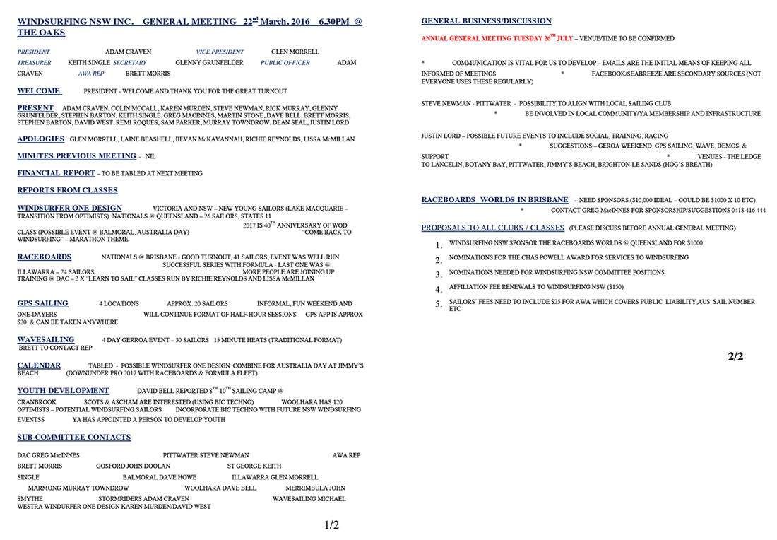 Thanks very much to all who were able to attend last night. Great to see so many people present and with an interest in moving forward organised windsurfing in NSW. It was especially encouraging to hear about the season just past from all the varying perspectives. With a renewed grand swell of positivity, I'm sure we're in for a great season over 2016/17.
