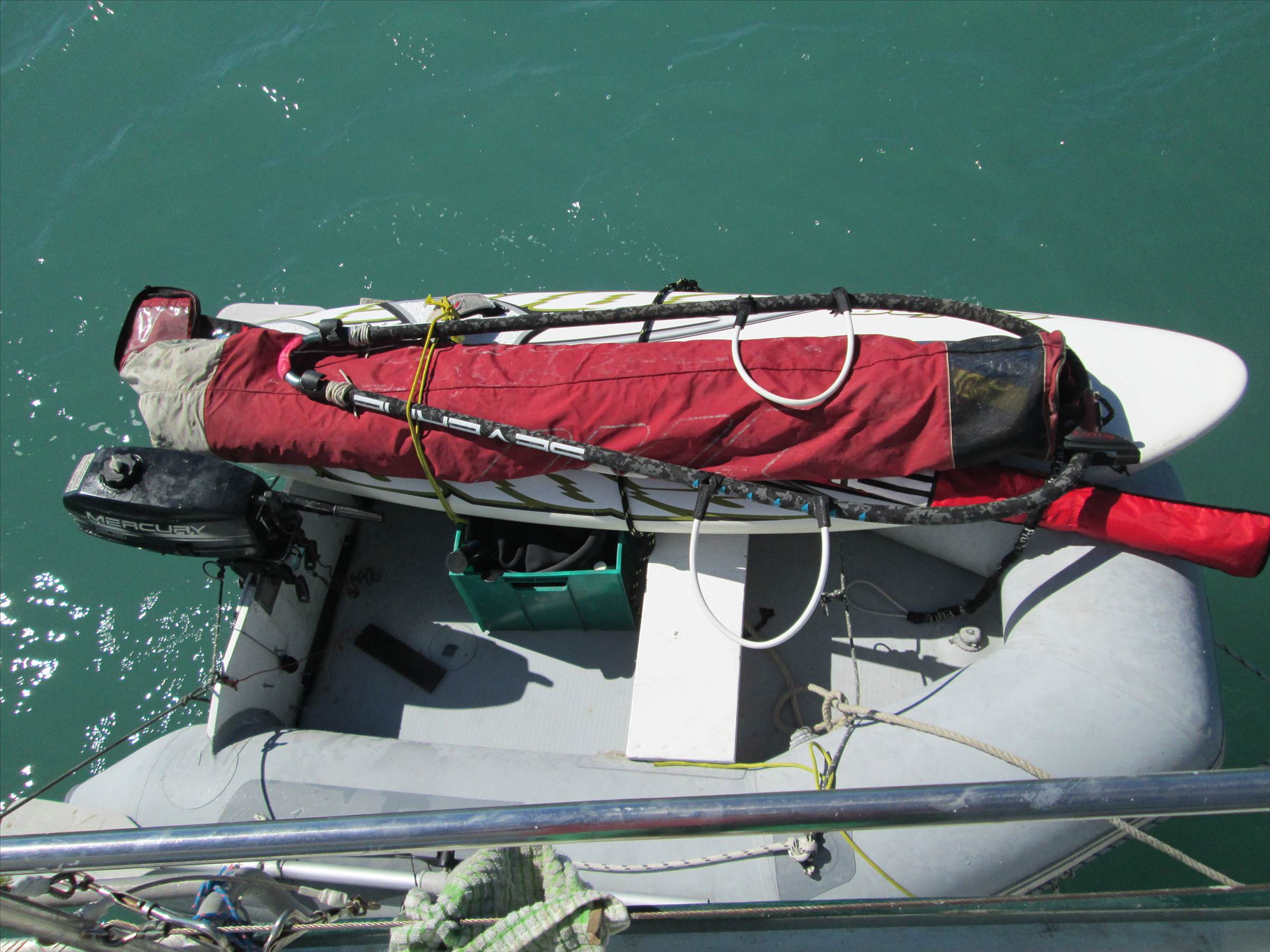 gear in dingy ready to go to the beach.