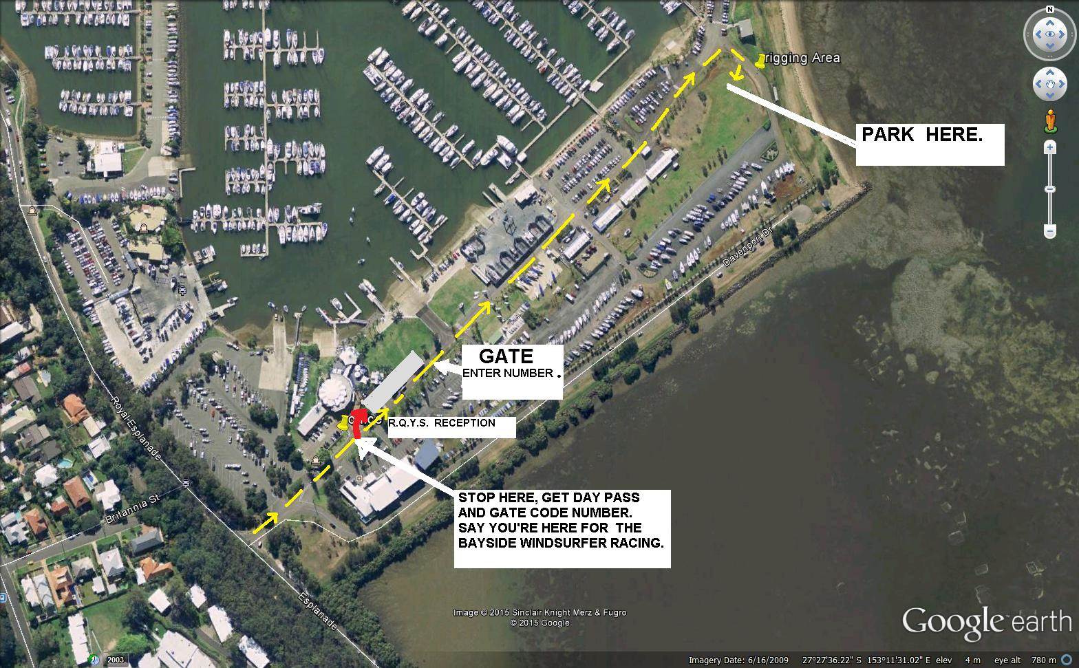 Race committee feels that Wynnum is just a bit to protected for south easters. So we have approached RQYS at manly and they have kindly allowed us access to their facilities , for those of you that don't know it, the beach at RQYS is a perfect venue in south east winds . On the day you will have to drive into RQYS and go into office and ask for day pass of $15. (that is total cost for day) they will give you key code for gate then drive down to rigging area..