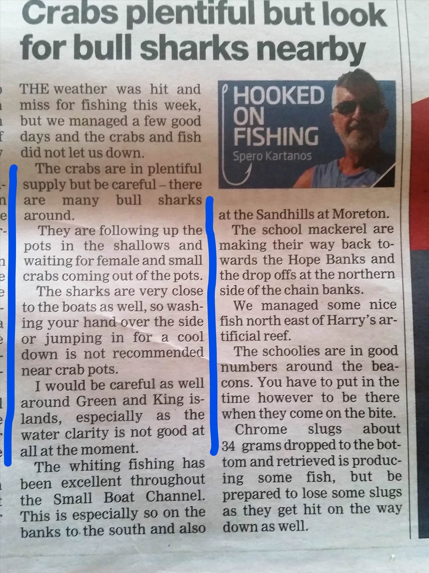 The attached fishing report from the Wynnum Herald suggests that bull sharks are hanging around the sand crab pots in the bay.