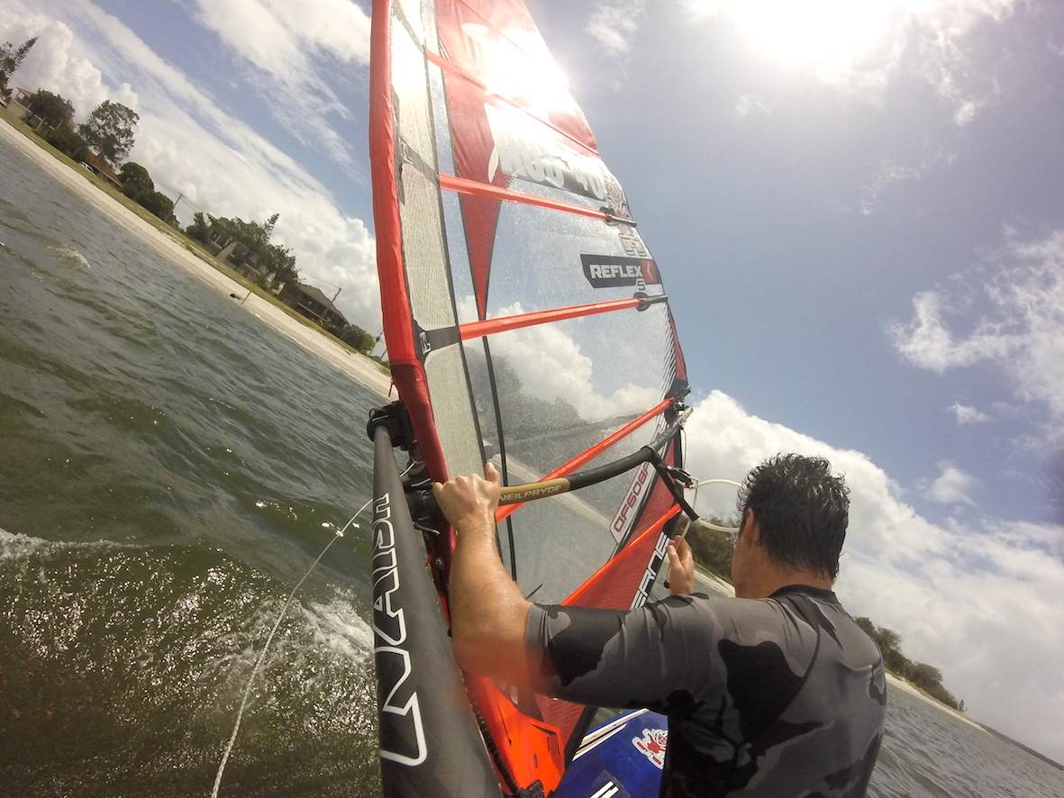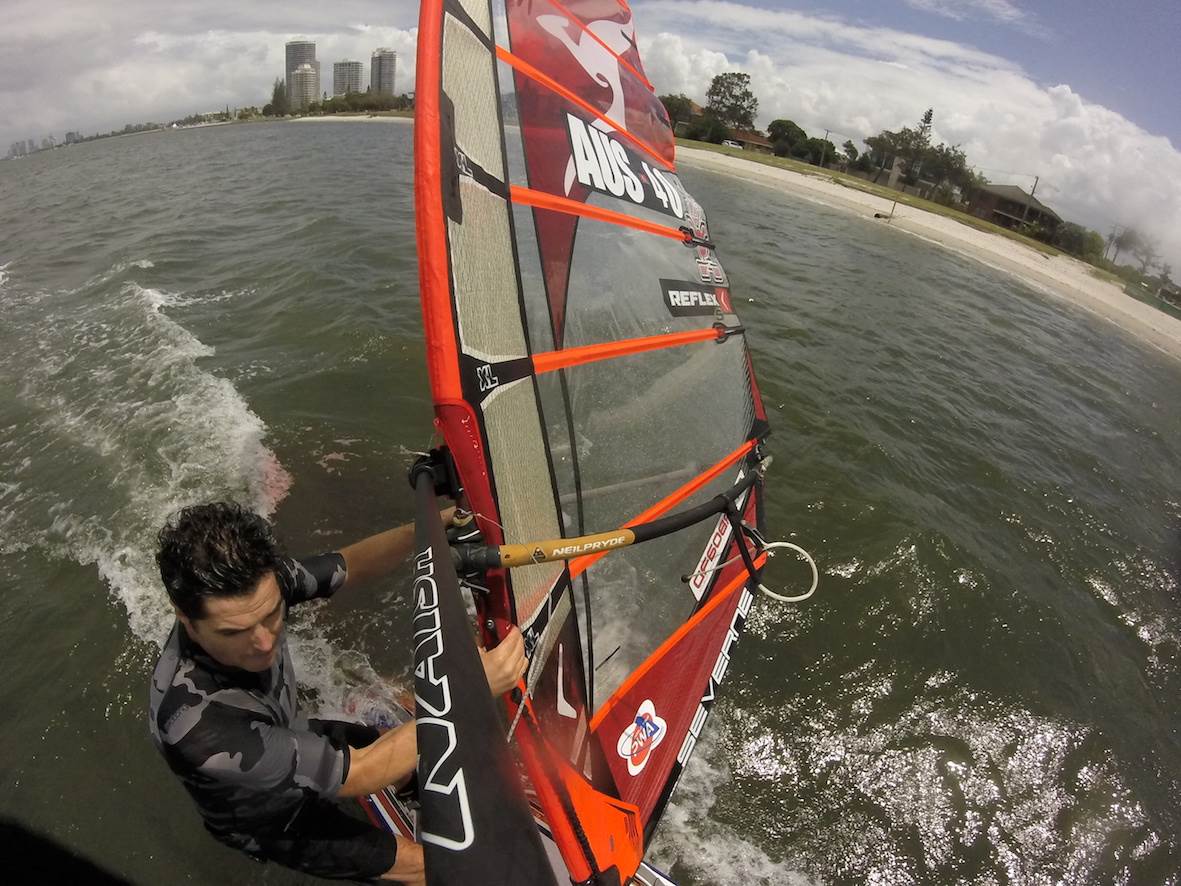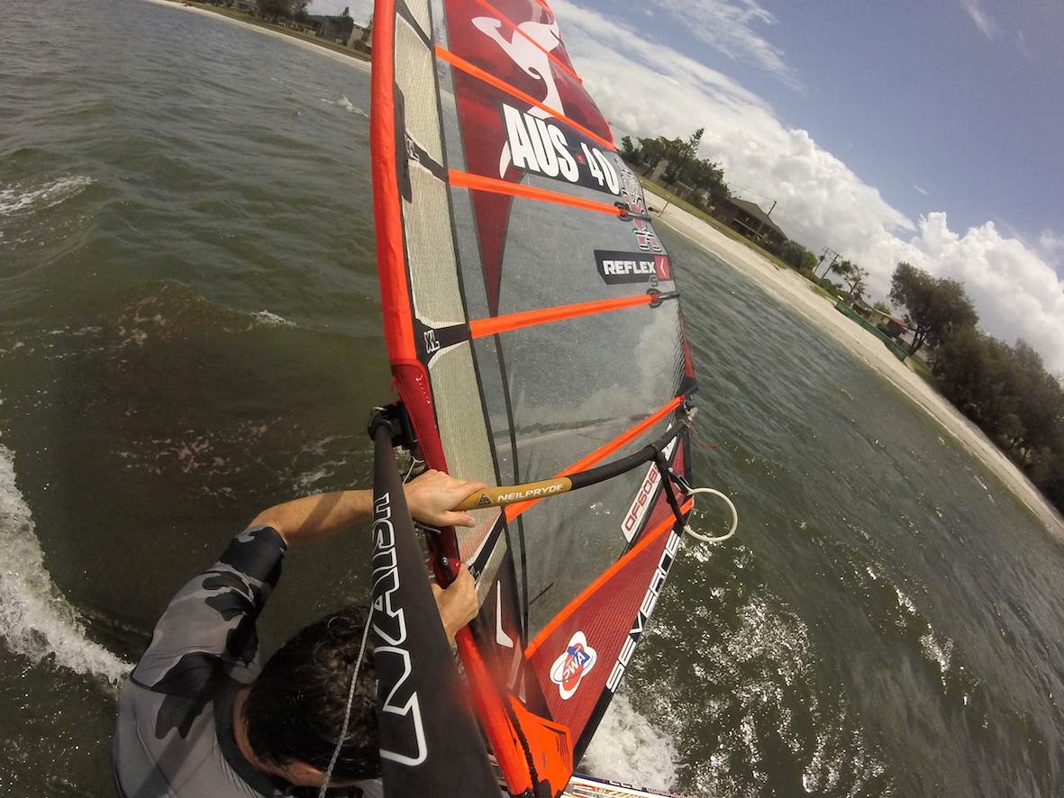 Surf FX lent me their custom GoPro mount for the Raceboard today. Attaches to the mast with a boom clamp. Thanks Greenie!