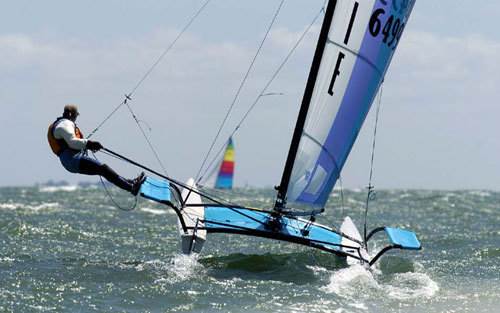and has a Spinnaker - reminds me of Uni days. 4 up 2 on trap in the foot straps, flying a hull - hanging on for dear life