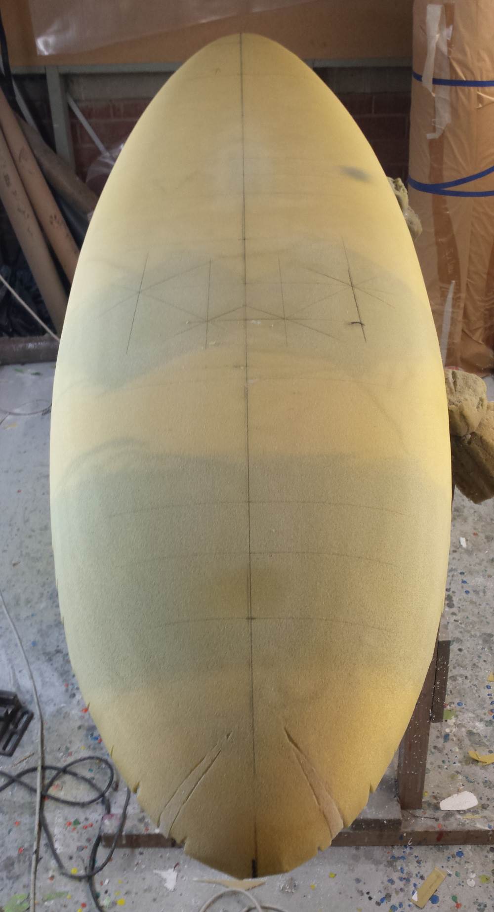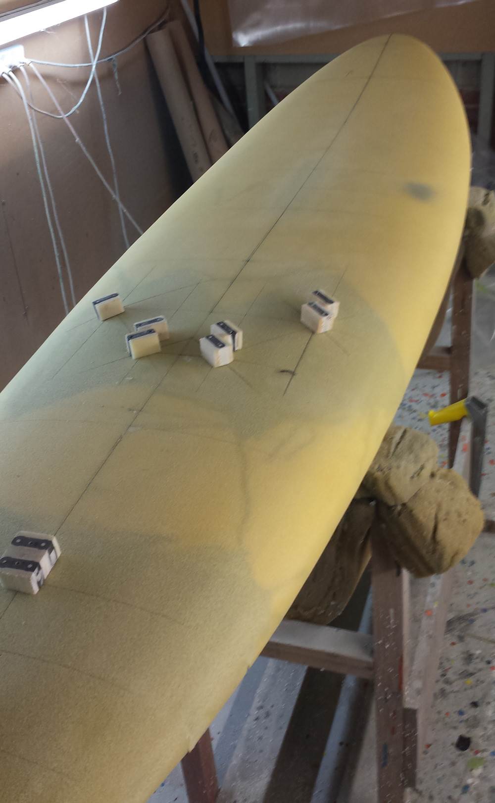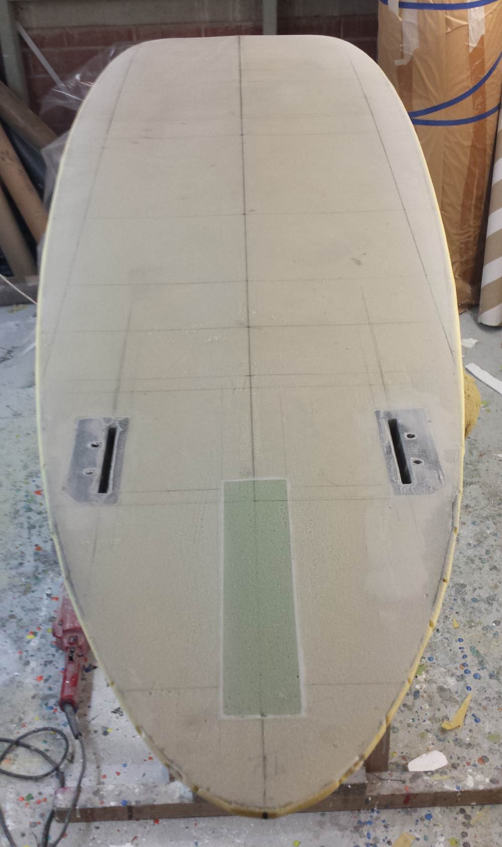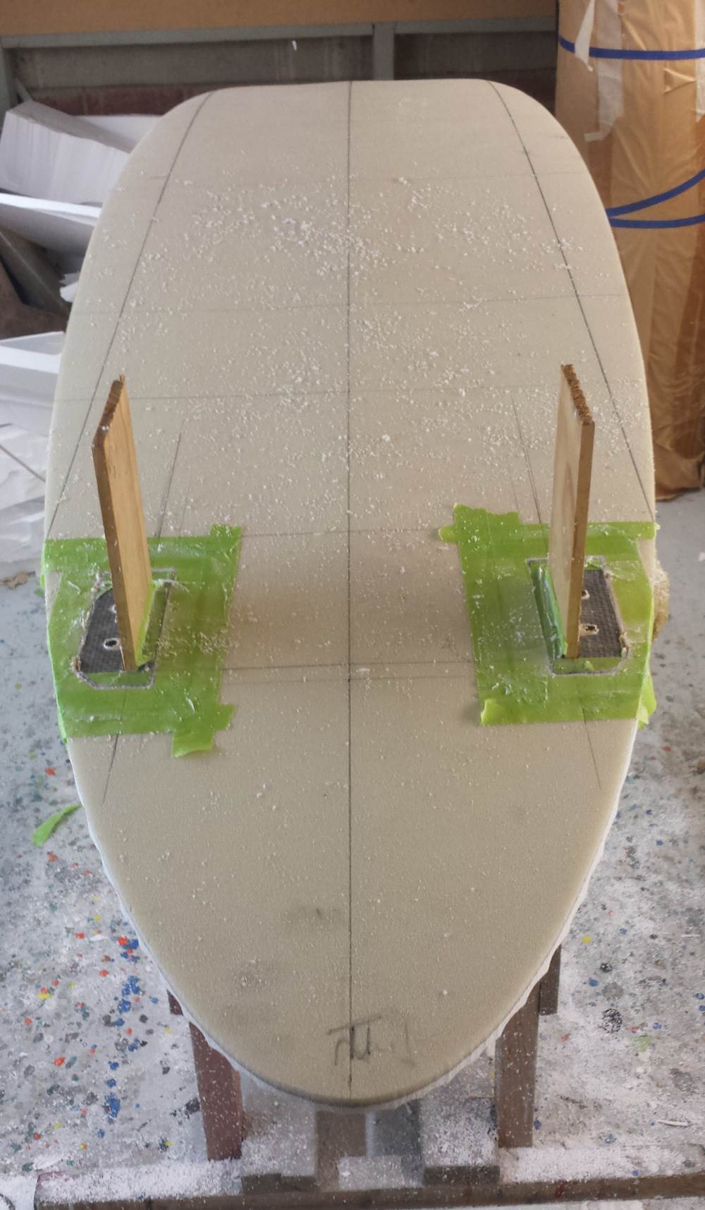 I have now sanded of the excess HD foam off that was wrapped around to the bottom. Marked and squared up the foot strap plugs ready for fitting tomorrow