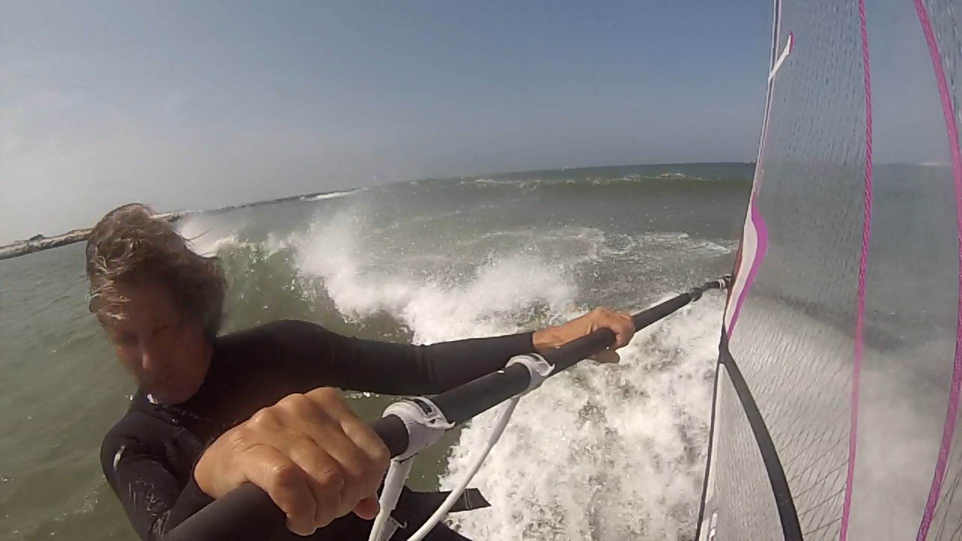 First session was exactly that, 8-15 knots and waist to chest high, 45 degree side on sloppy closeouts. Rigged the board up with an Ezzy Elite 6.1 and put in a small freestyle 24 fin in to avoid hitting the sandbars on the low tide and just because. ;) Obviously the board is super stable at 74 cm's wide but it is thin so you sit low in the water, doesn't have the corky feel of the newer wave or FSW boards. First quick tack, way to easy. Set comes through, one quick pump and the board is off like a bullet, closeout section, bank off the foam for a floater with only front foot in the strap....sweet, I was really surprised and the board has quite a bit of nose scoop so no worries on sticking the nose on re-entry. Second run I do a pivot jibe and was surprised how quick the board comes around. Another wave and I'm smiling as it's fitting the bill. Noticed on some of the gusts, that to plane you have to point downwind, def. not a beam reach planer, but comes up quickly on a deep reach. This was pointed out in the Mag, reviews. Once on a plane, the board stays there, even with a the small fin in.