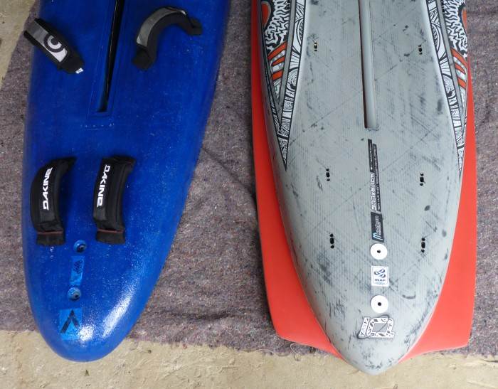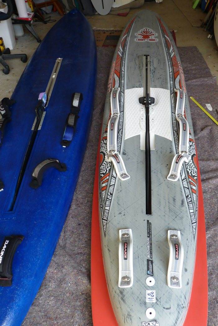 3) the footstraps supplied with the board are a bit soft for my liking. They tend to collapse or twist the "wrong way" sometimes making it hard to get the foot in quickly. I've replace the back straps with ones off my old formula board, and stiffened up the beating straps with plastic strip.