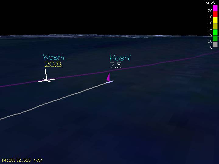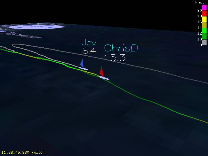 The white pole looking thing with 20.7 knots above it is my top speed marker. I'm in the foreground slugging up wind. I guy started at Rankines, but wasn't able to get upwind. So I went downwind and joined him, but then he left, so I slugged to rejoin Chris. Chris is in the background coming out of his top speed run and hitting 23.4 knots. His TS marker is also displayed.