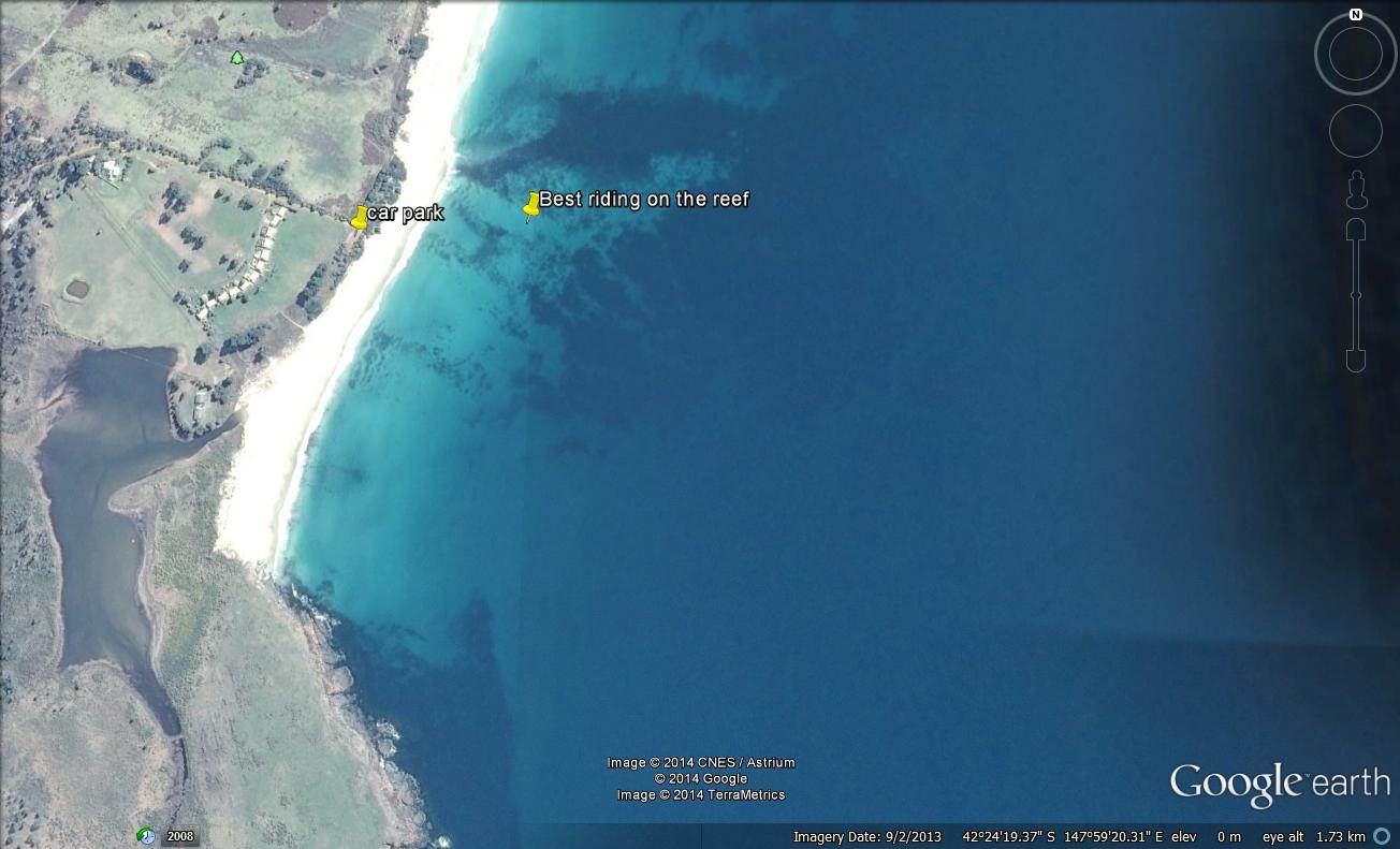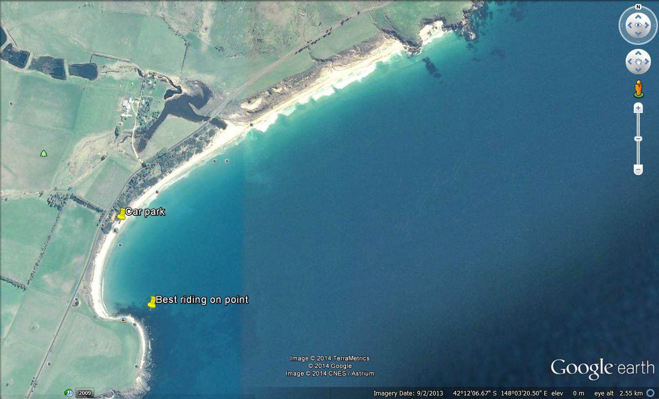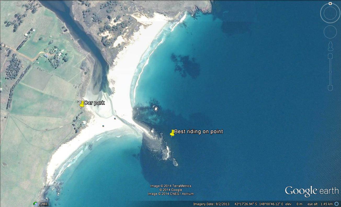 Best on SSW wind which is gusty due to the hills close by but still OK. Best riding is right on the reef, try not to end up down wind on the beach as the shore break can be a bit of a pain