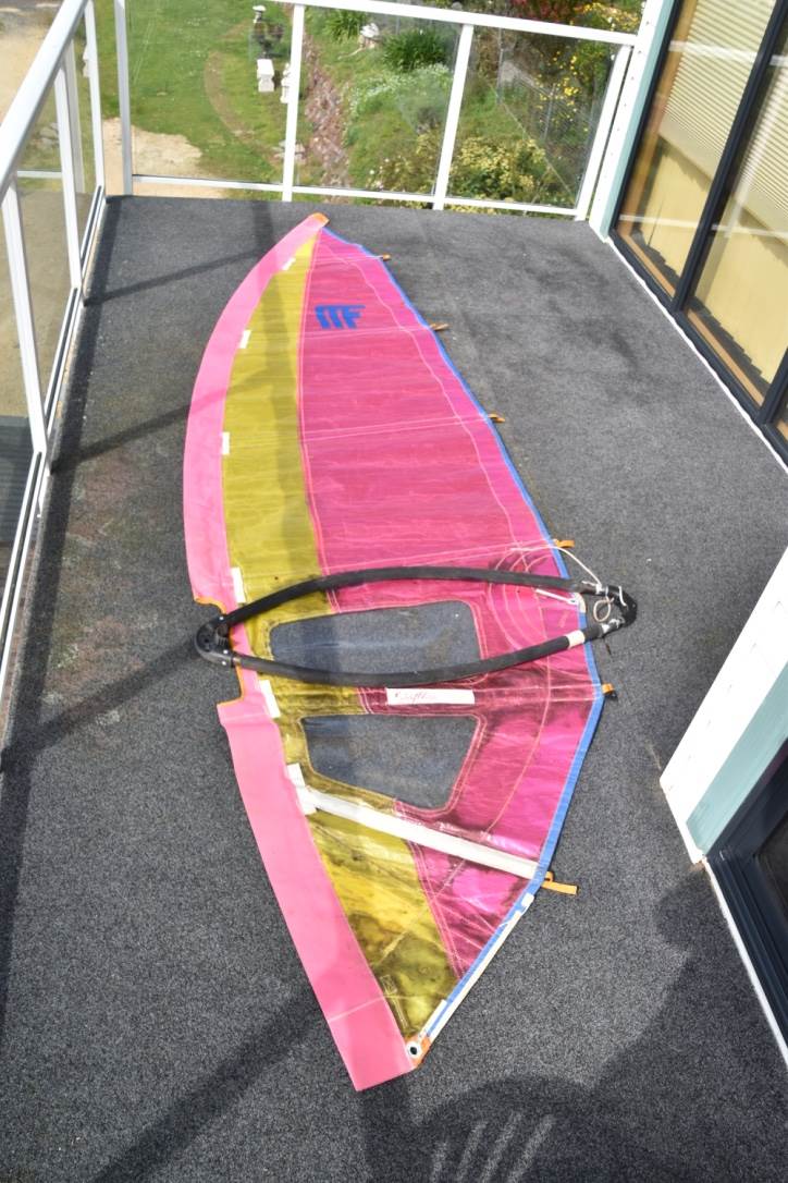 A bit of Midget Farrelly windsurfing history … 3.3 metre Farrelly Wing sail, personally sailed by Midget in Hawaii. Most of my 10 years of wavesailing was on Farrelly Wing sails. When I phoned him in the early 90s to replace my well-worn 3.3, he had stopped making them. So he said ‘’here, you can have this one’’. Complete with the MF personal Midget Farrelly logo. Very happy to have this collector’s item.