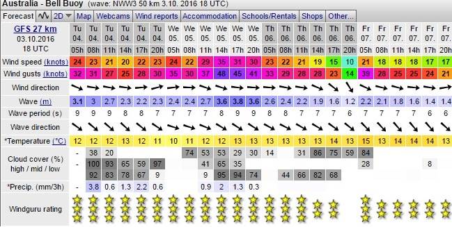 9:30 am low tide, 30 knots westerly going towards 40+ knots WNW as the day goes on and 3+ m swell.