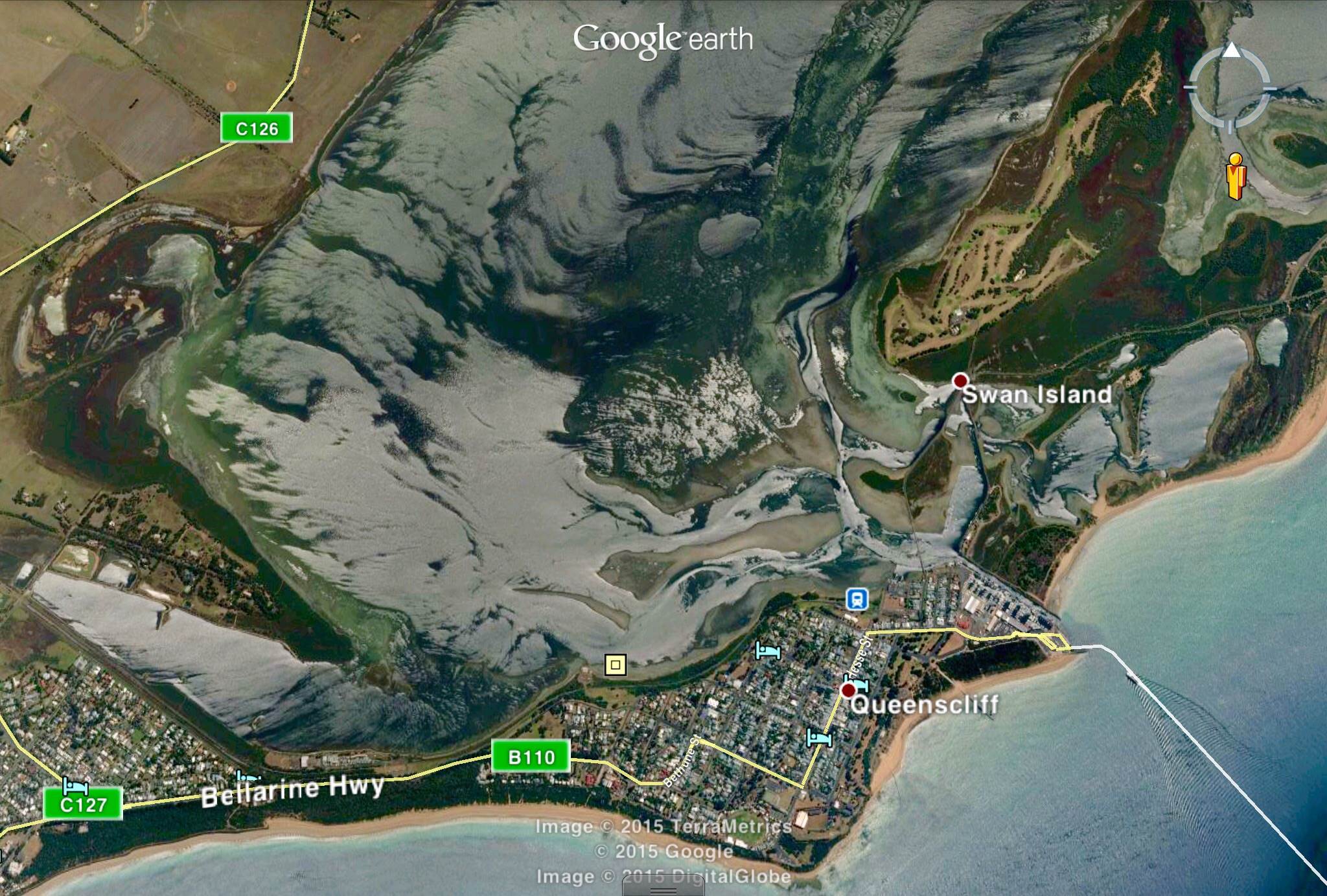 Swan Bay, Queenscliff. This place is awesome. Works on any direction, but most fun when west thru to northerly. I've seen this place with 50knot winds and water spouts and only half foot of chop, next to mud bars flat as. Miles in every direction at high tide. The yellow square is the launch spot, QLYC; they grew the grass for us to rig on. Need weed fins and booties. The Connewarre Cremasters often sail here, awesome chaps.