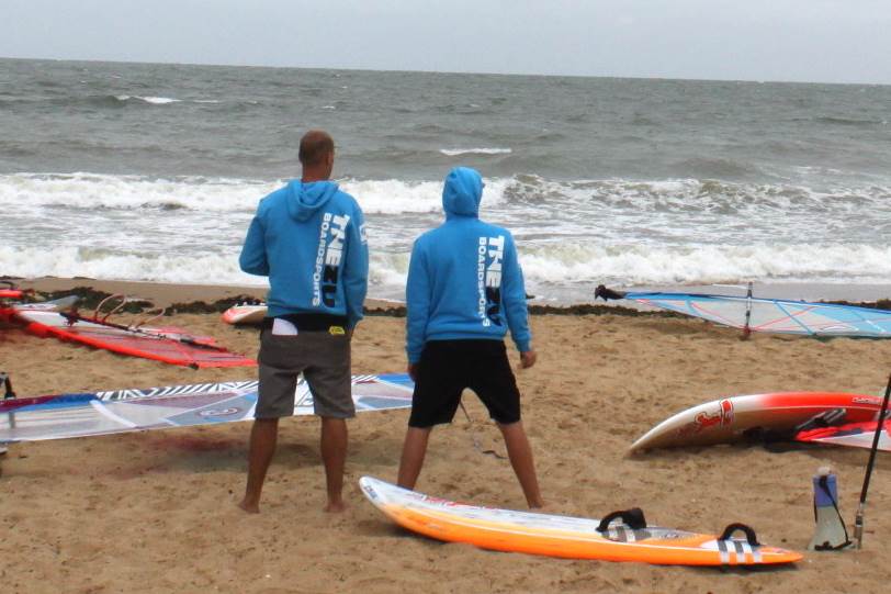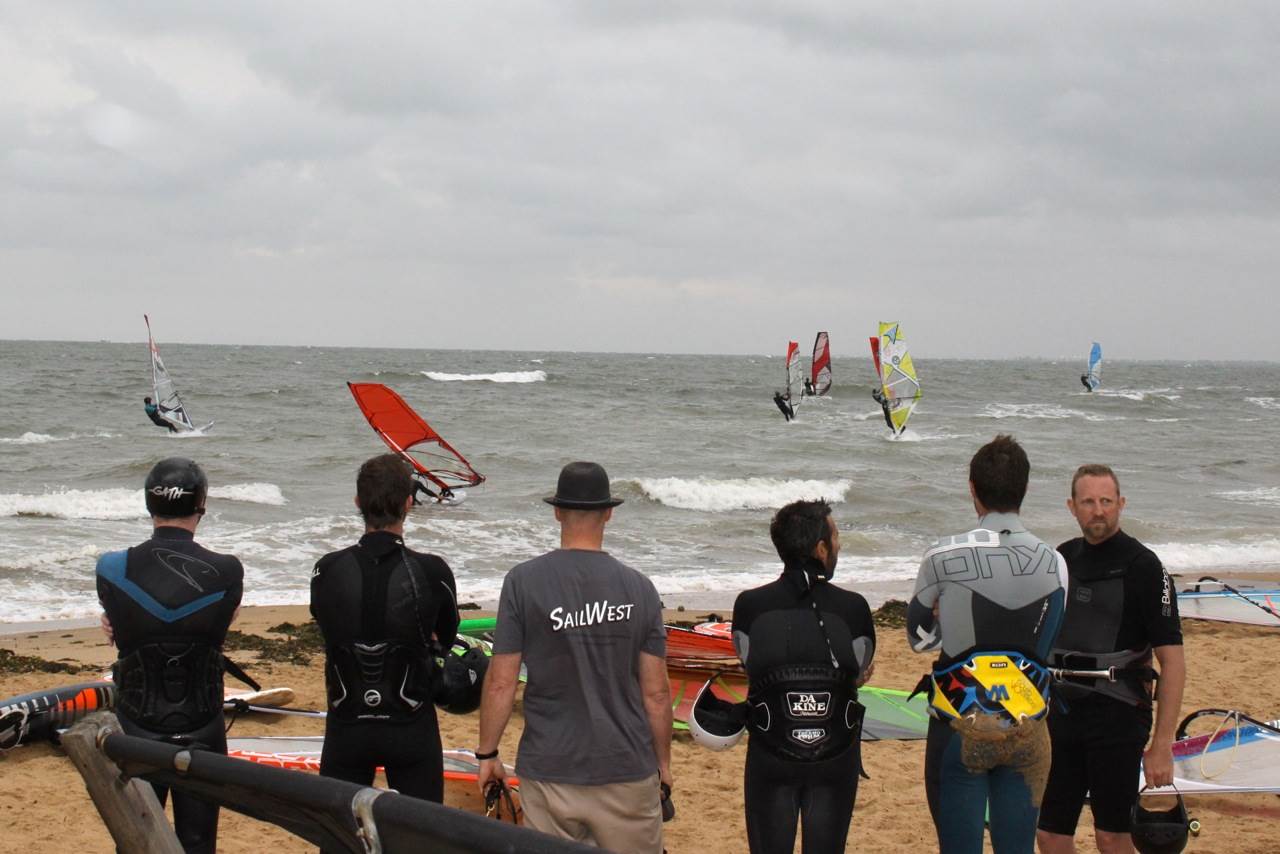 We request that everyone not sailing in a heat windsurfs 250m upwind or downwind of the competition area or spectates from the beach.
