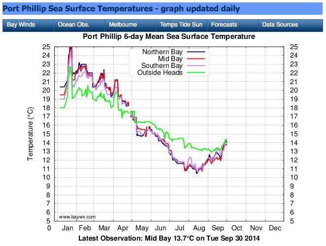 Average temps for the bay are at www.baywx.com.au/baytempsav.html