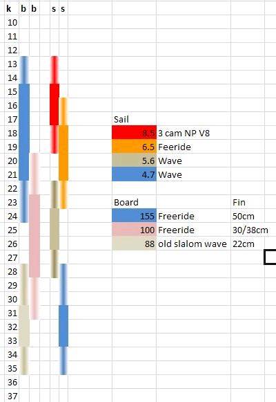 solid lines is ideal use, thinner line is marginal (difficult to plane or getting out of control). I've coloured it to match my equipment.