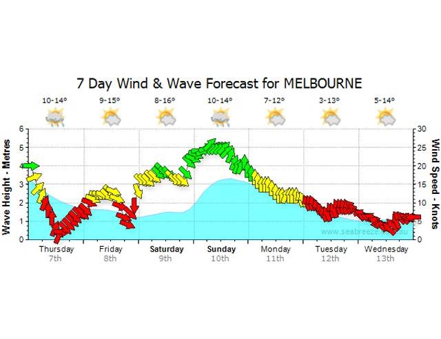 BOM now says: Sunday 10 August. Strong Wind Warning for Sunday for Port Phillip Winds. Northwesterly 20 to 25 knots becoming southwesterly 20 to 25 knots in the morning then tending southerly in the late evening. Winds reaching up to 30 knots during the afternoon and evening.