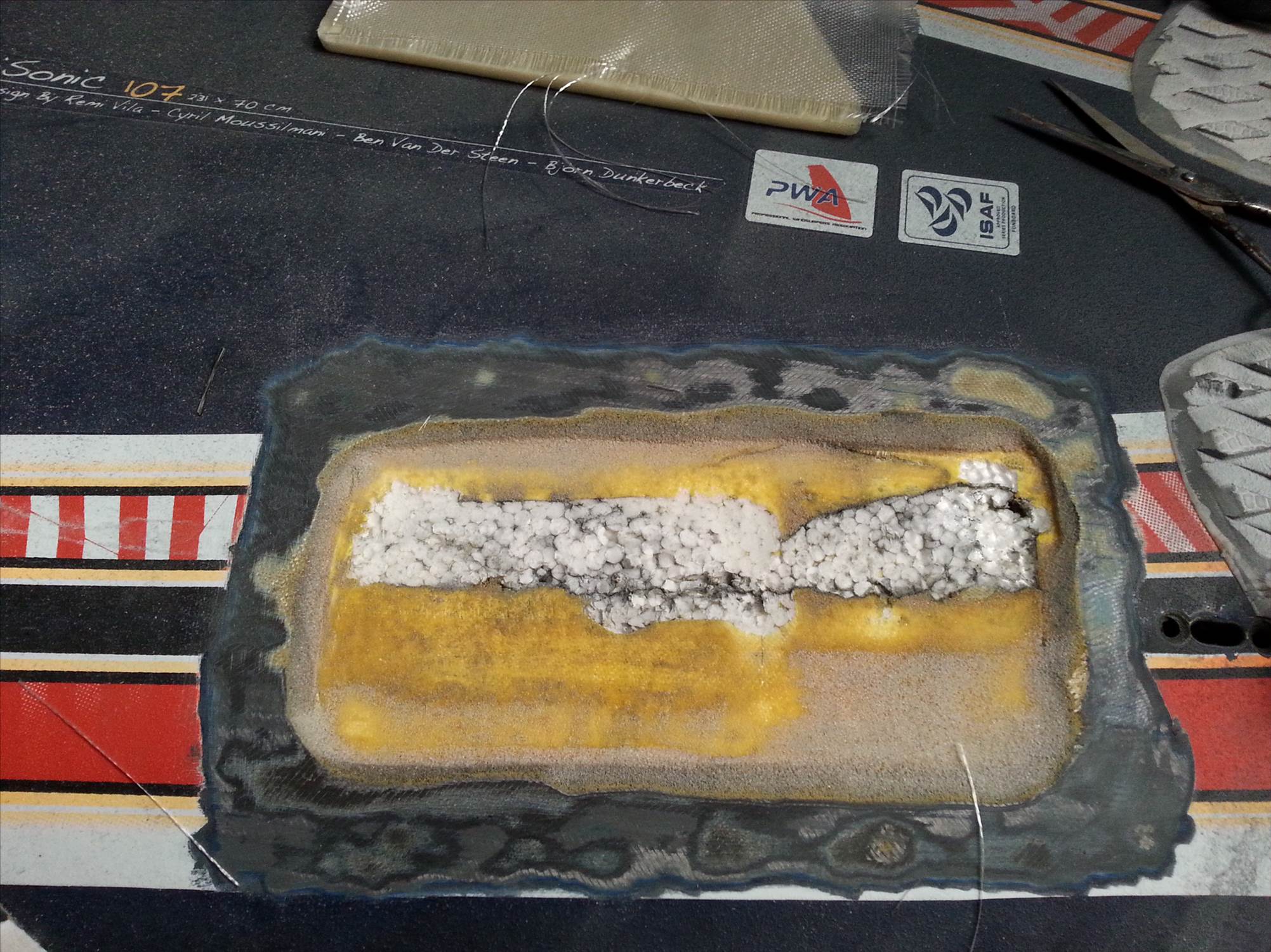 That's another good theory! When the cloth is squashed by vacuum it does get fairly thin, and the layer under the sandwich foam is usually about 100g. (well that's what I use over most of the board, but with an extra 150g of carbon in the impact areas).