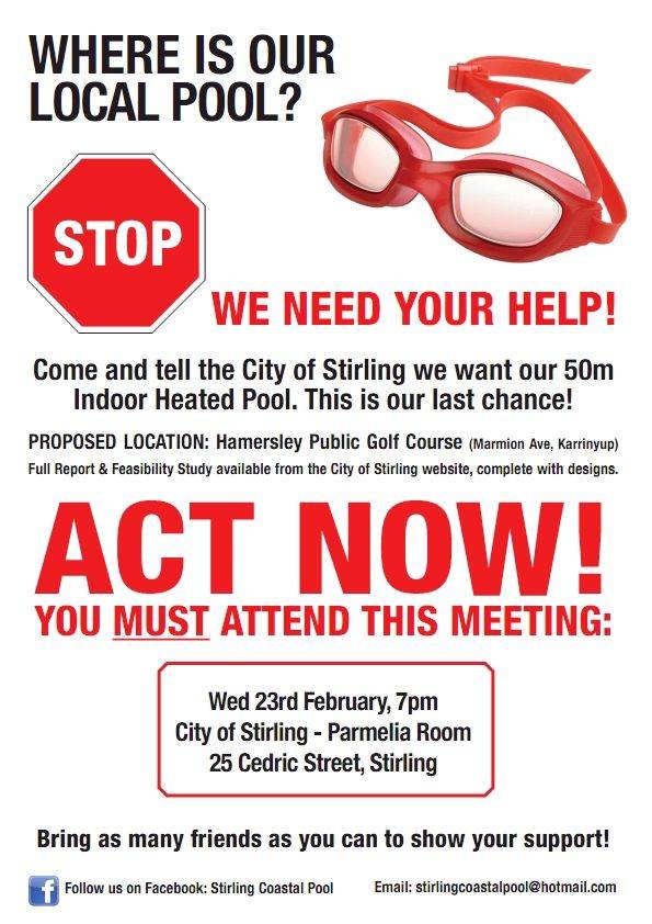 I came across this post today and the flyer that was uploaded. There is now a Special Council Meeting set for Thursday April the 7th 2011 in which the council will discuss and debate the proposed swimming pool. This will enable the pool to be heard on its own and not fight for time along with a big list of other council agenda items. My understanding is that this is the night where the councillors will vote for or against the pool. We need as many people as possible to attend the meeting. More details to follow........Lynley (People for Stirling Coastal Pool)
