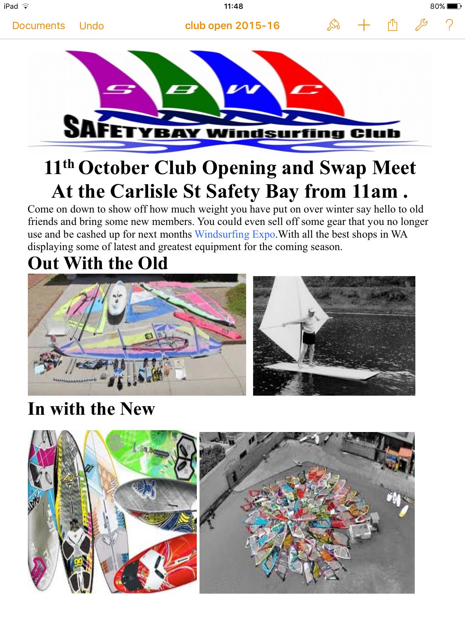 Swap meet starts at 11am followed by the usual bbq lunch then sailing. We hope to see you all there.