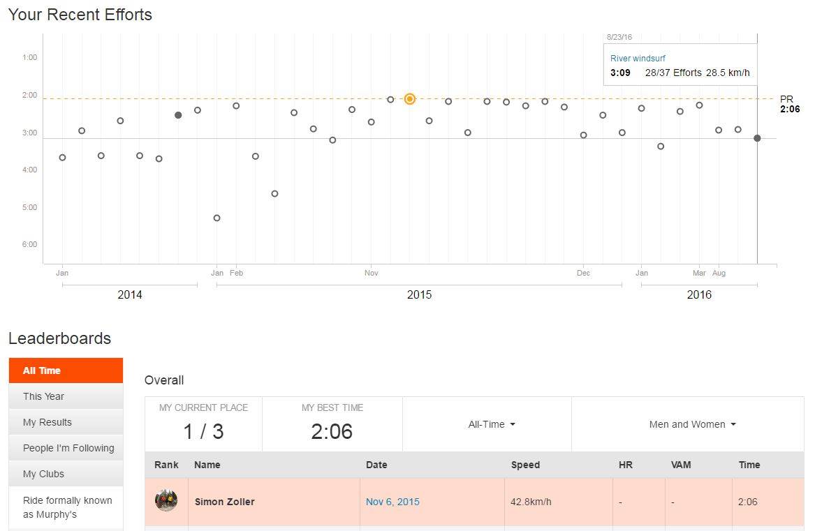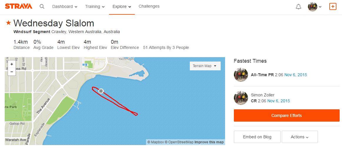 I attached some screen shots from my Strava segment, called "Wednesday Slalom". Now, there's only 3 people have recorded this course on Strava but I am certain that many more sailors have already recorded GPS data across this course, they just haven't uploaded to Strava. I am also certain that my course record, set on an old Kode 103 and Blade 6.2m, has been thoroughly beaten numerous times better sailors than I.